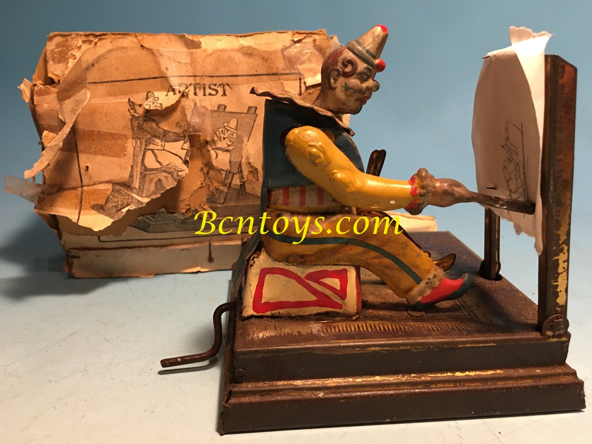 Payaso Artist fabricado por Philipp Vielmatter con preciosa litografía. Berlín entre 1885 y 1905. A través de unos discos el payaso dibuja sobre papel. Uno de los discos dibuja viva España.