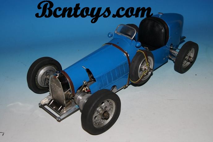 Bugatti realizado en plancha con motor de gasolina. Ruedas de radio. Mide 46 cm. Al dep?sito de gasolina se accede mediante tap?n situado en el asiento del conductor. Tapicer?a de cuero. El Bugatti lleva suspensi?n. A destacar el detalle del radiador con placa grabada Bugatti. Sin duda una pieza nos atrevemos a decir, ?nica, fabricada por alg?n modelista.