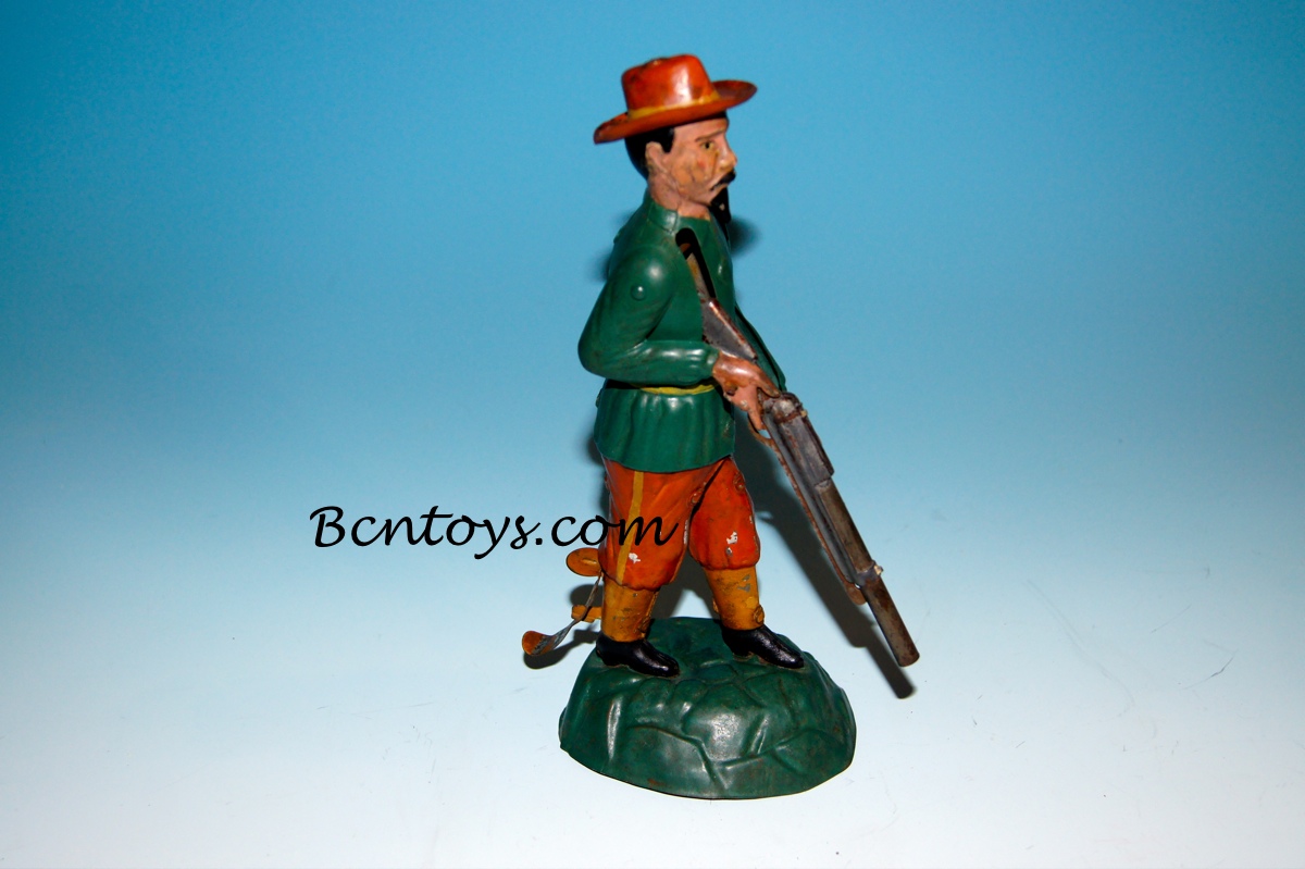 Cazador pintado a mano. 25 cm. Personaje parecido a Bufalo Bill. Con mecanismo de palanca. Atribuido a G?nthermann. Principios siglo XX.