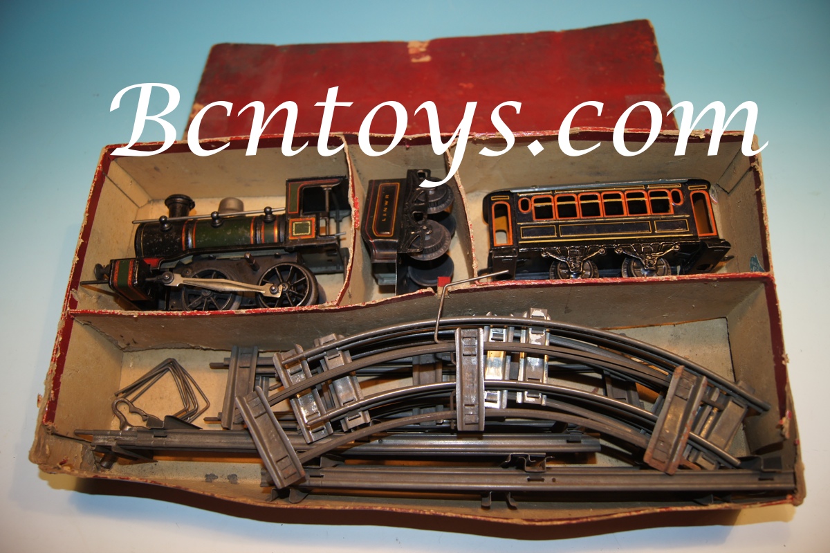 Estuche Bing. Tren escala 0. Compuesto por locomotora dos ejes litografiada con tender, vagón y circuito de vía. Caja original. Funcionamiento a cuerda.