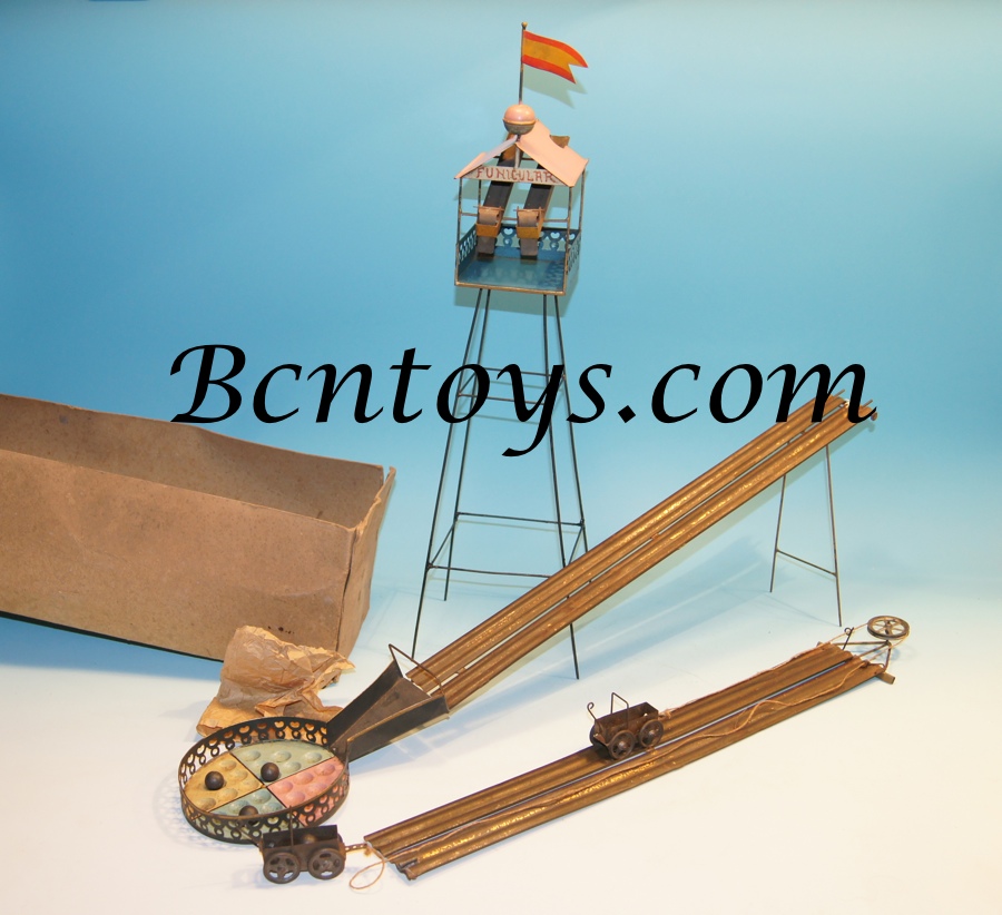 Funicular. Manufactura Espa?ola de Juguetes. Barcelona. Circa 1919. Pintado a mano y cromolitografiado. Espectacular juguete compuesto por dos vagonetas que suben y bajas por los ra?les en funci?n del peso de las bolas que se depositan en la parte superior trasera de la torreta.