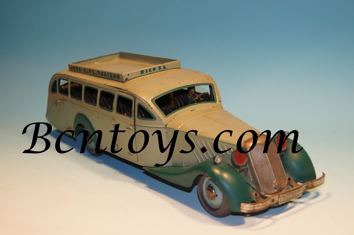 Guagua Rico bicolor con sirena. Versión con ruedas metálicas. Años 30, preguerra. 50 cm. Funcionamiento a cuerda con mecanismo de paro de sirena.