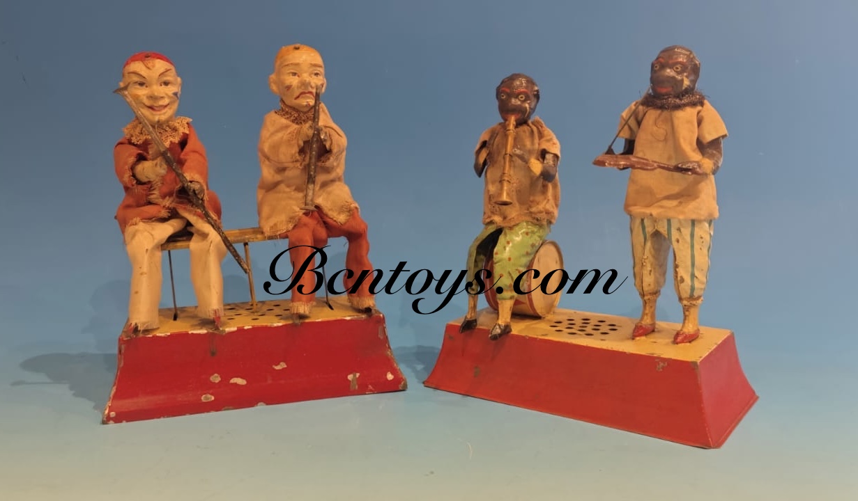 Pareja de músicos Günthermann pintados a mano con clarinete y violín. Funcionamiento a cuerda.