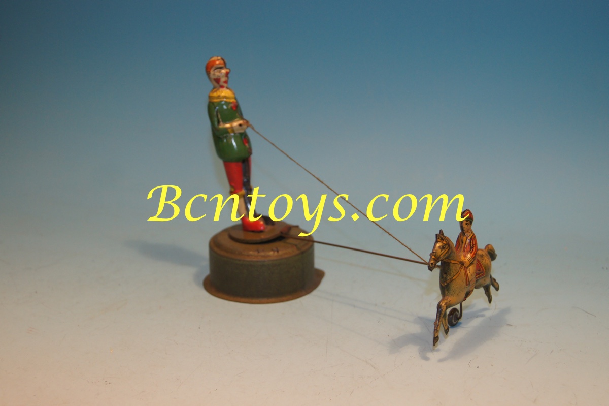 Rarísimo juguete de RSA. Rico. Años 20. Con precioso payaso y caballo con jockey litografiado. Mecanismo de cuerda.