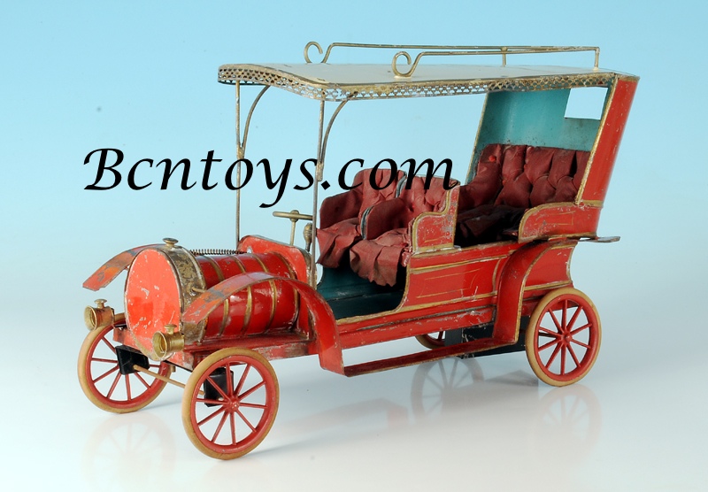 Limusina. Madrid. 40 cm. Pintada a mano. Fabricante desconocido. Mecanismo de cuerda con fileteados dorados. Interior de color azul celeste, asientos en tela capiton? y techo con porta-equipajes. Faros de fundici?n. Neum?ticos de caucho.