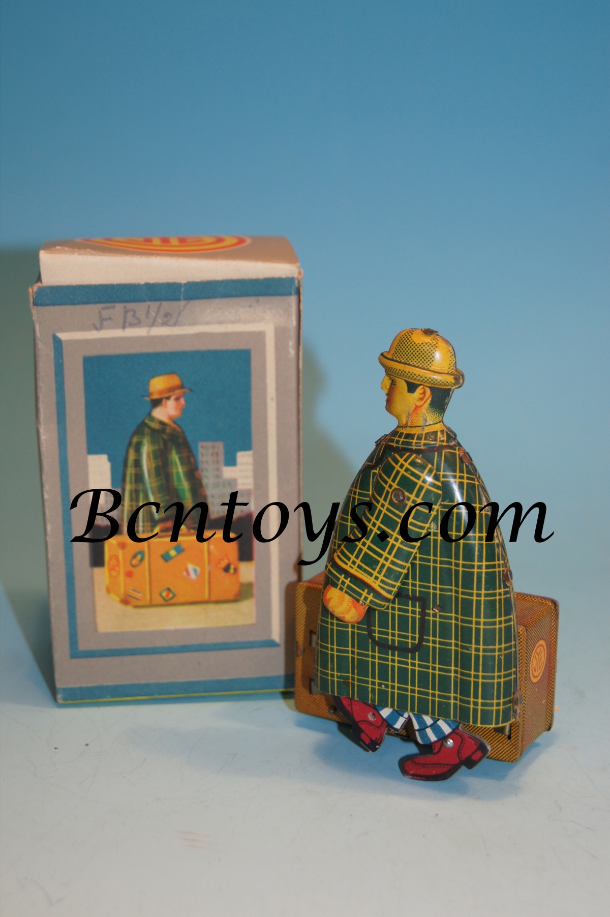 Maletero JYE. En caja original. Personaje litografiado con mecanismo de cuerda. En perfecto estado. A?os 50.