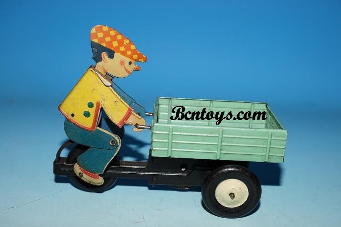 Moto-carro litografiado de Rico con personaje. Funcionamiento a cuerda y en estado de marcha. En perfecto estado. 14 x 11 cm. A?os 50.-