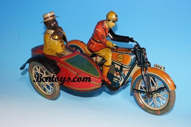 Moto Tuf Tuf con negro en sidecar en preciosa litografía y con bonita versión de ruedas. Mecanismo de cuerda. Años 30. Impecable estado.