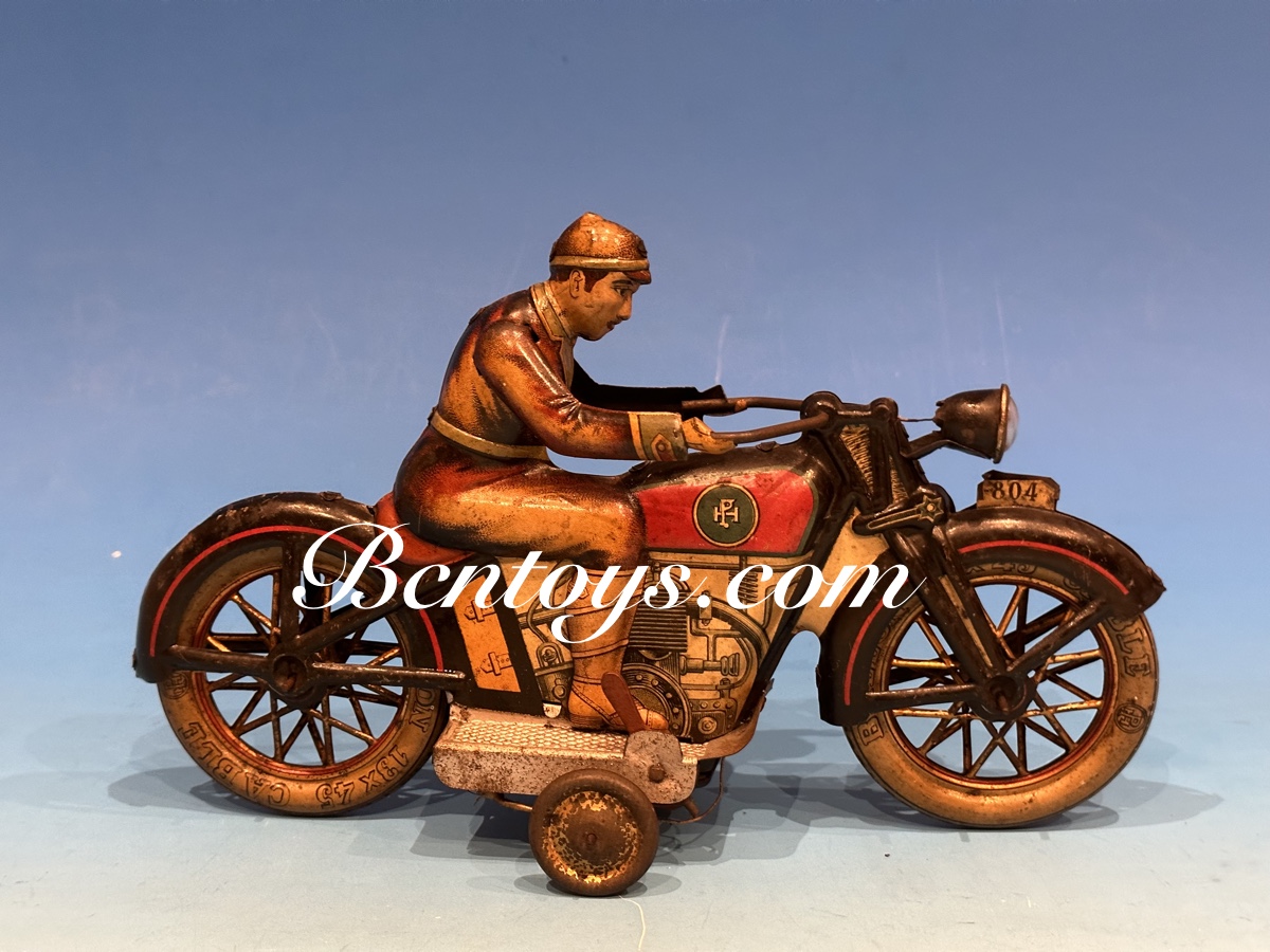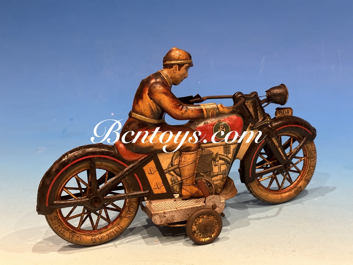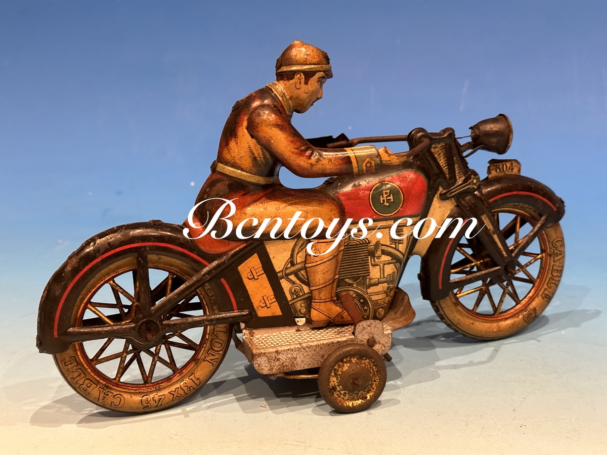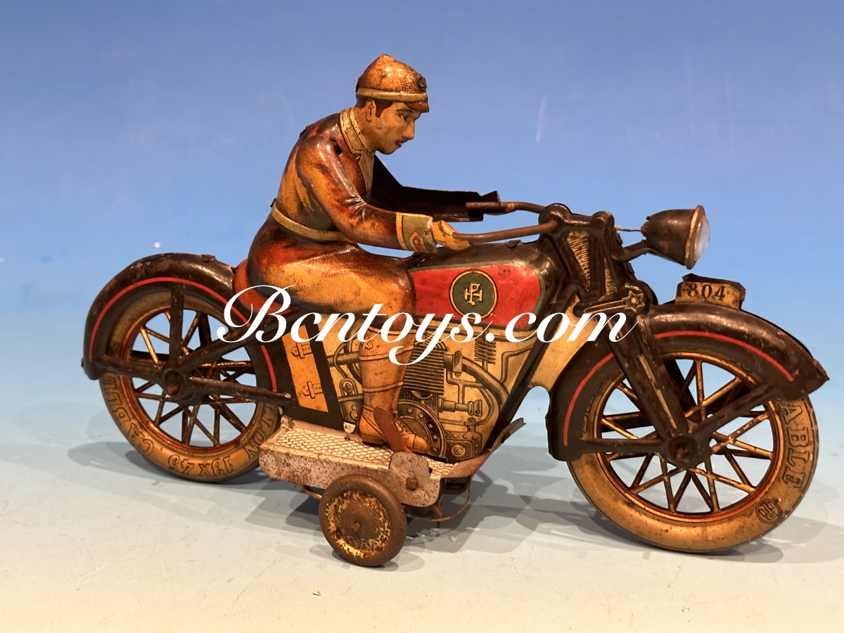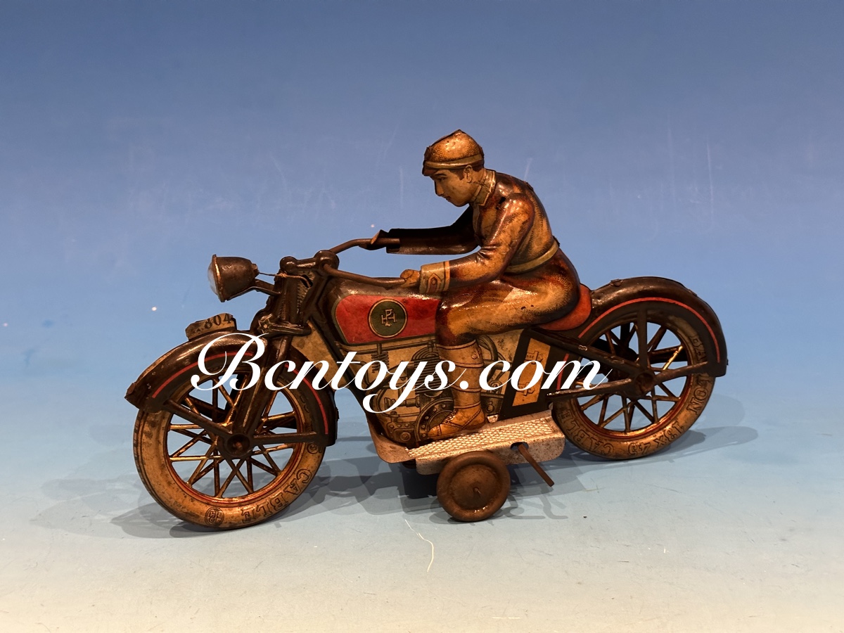 MOTOCICLETA PAYA LITOGRAFIADA CON MECANISMO DE CUERDA. CON LUZ. RUEDAS CROMOLITOGRAFIADAS. 29 CM.