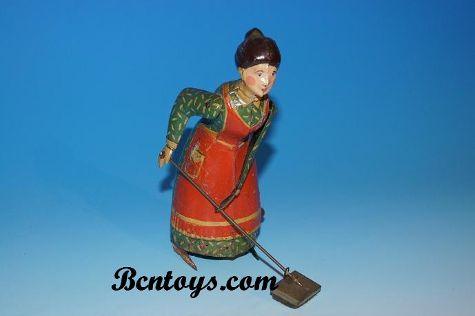 Personaje que representa una mujer limpiando el suelo. Figura de 20 cm pintada a mano con mecanismo de cuerda. Posiblemente de H. Fischer. A?os 20. Alemania.