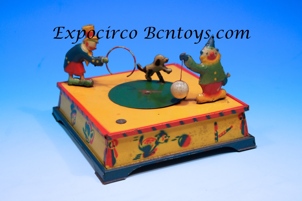 Juguete musical de circo compuesto por dos payasos y un perro que gira y salta por el aro. Rar?simo juguete de hojalata y madera de Reig. No en venta. A?os 30.