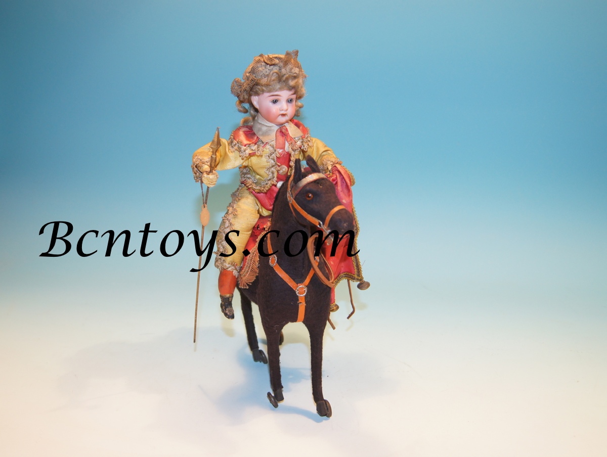 Picador con cabeza de porcelana. Todo original. Ropas de seda. Funcionamiento de arrastre. 33 cm. Caballo de fieltro sobre ruedas de fundici?n. Hacia 1900.