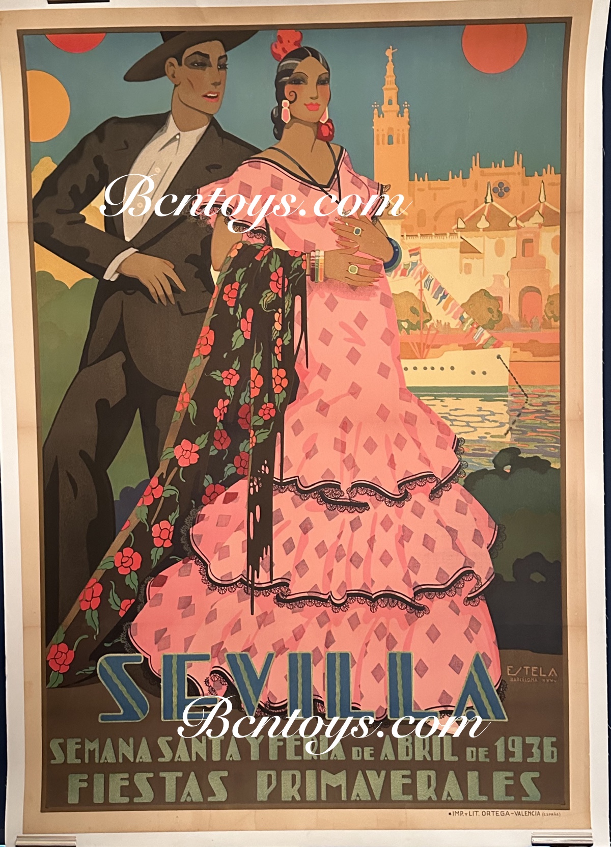 Poster Sevilla. Fiestas Primaverales 1936.. Ilustrador Estela. Barcelona.