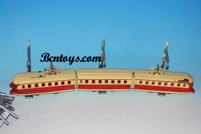 Automotor eléctrico de Rico. Tres unidades. Funcionamiento eléctrico. Una de las piezas más raras de los trenes de escala 0 fabricado por Rico. Algunos desperfectos de pintura como se puede apreciar en las fotos. Incluye postes originales de catenaria. Una pieza extraordinaria.