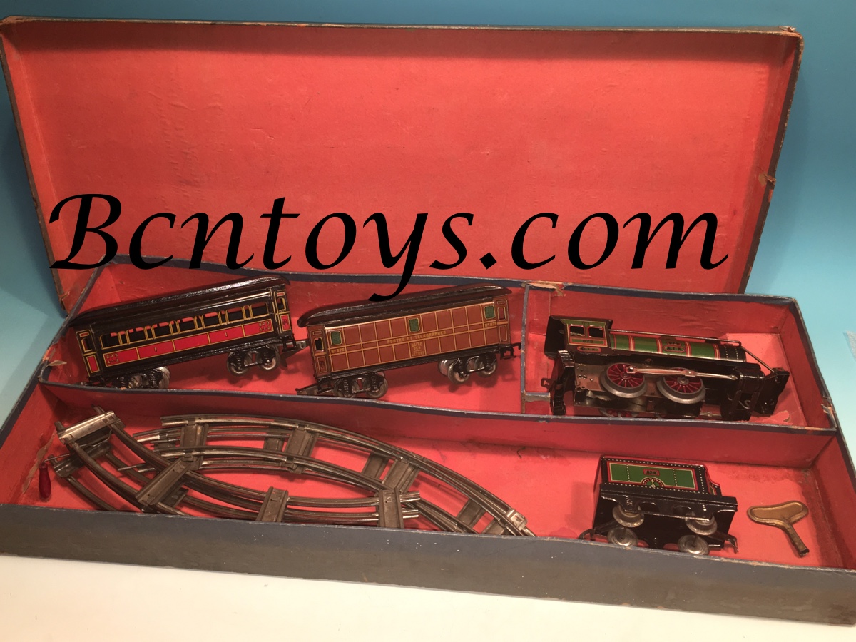 Conjunto tren Payá. Escala 0. En caja- Locomotora 879 + tender + vagón correos-telégrafos y pasajeros.