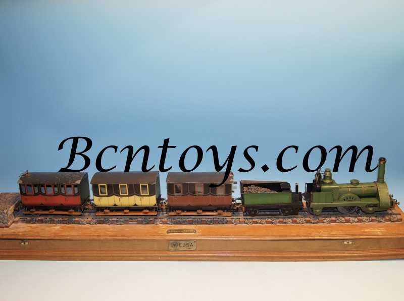 Los tres vagones de 17 cm cada uno que en la ?poca costaban 125 pesetas cada uno. El conjunto viene montado sobre peana original de Manamo con placa de lat?n conmemorativa. En su interior contiene amplio circuito de v?as originales Manamo as? como un transformador de la misma.